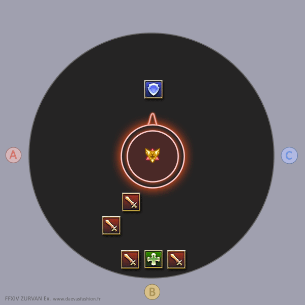 Comme les précédentes Croix du Sud, le groupe va se déplacer en même temps d’un quart de cercle vers la gauche (donc ici vers A) pour laisser les aoe de glace derrière eux.